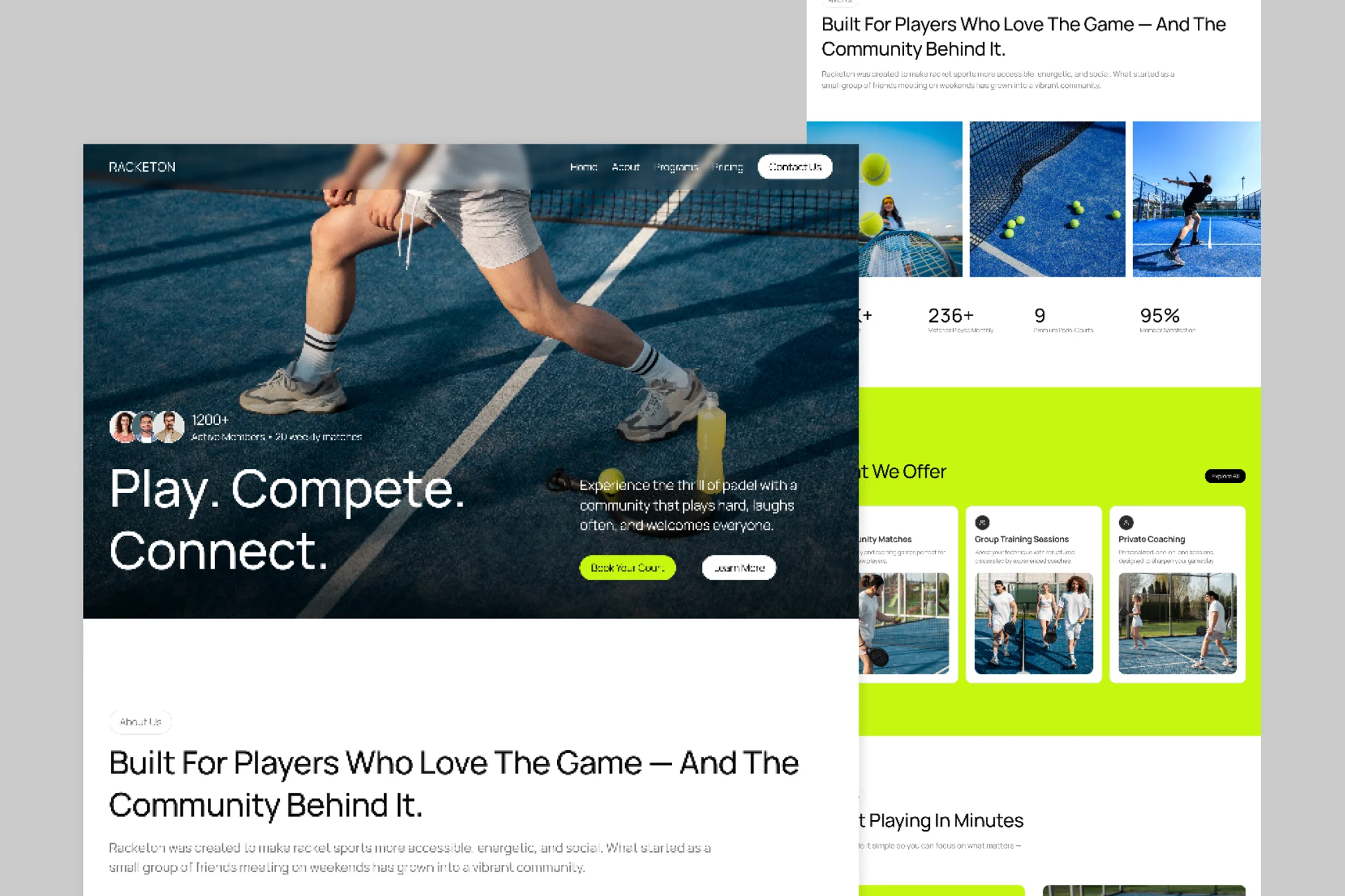 این طرح گرافیکی با UI/UX تازه و جذاب، حس انرژی، رقابت و هیجان ورزش پادل را منتقل می‌کند. Racketon به عنوان یک لندینگ پیج قدرتمند، مناسب معرفی کلوپ، ثبت‌نام دوره‌ها، فروش آنلاین تجهیزات، نمایش گالری بازی‌ها و جذب عضو جدید است. طراحی مینیمال اما پرجنب‌وجوش آن، برای ورزش‌های راکتی مانند پادل ایده‌آل می‌باشد.